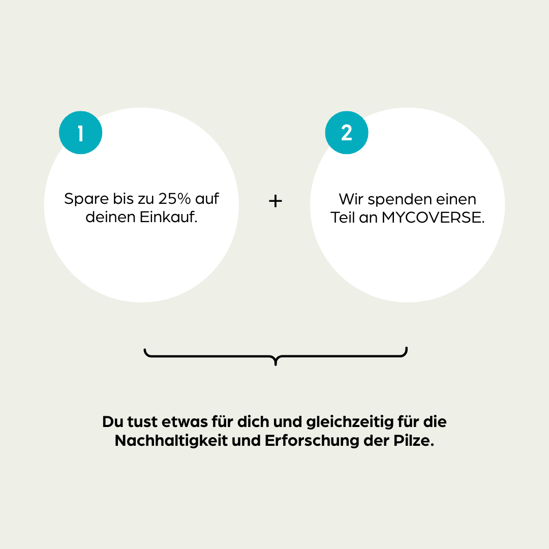 Bei jeder Bestellung spenden wir 2% vom Umsatz an die MYCOVERSE Foundation - eine gemeinnützige Stiftung, die das enorme Potenzial von Pilzen für Gesundheit, Landwirtschaft und Umweltschutz erforscht.